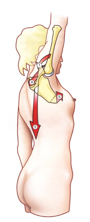 El serrato anterior presenta un gran brazo de momento también para provocar la basculación posterior escapular. Este músculo presenta una línea de acción capaz de provocar simultáneamente la basculación externa y la basculación posterior escapular: