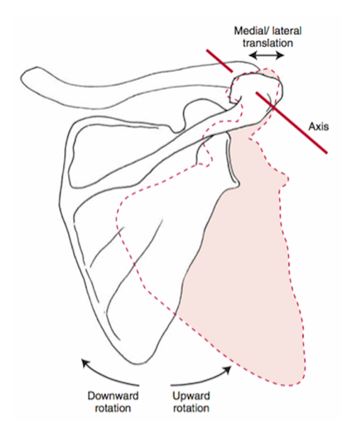 Durante la rotación interna del hombro, el serrato anterior, junto con el pectoral menor, se encarga de provocar un cambio de orientación escapular de unos 40º-45º mediante la anteversión escapular.
